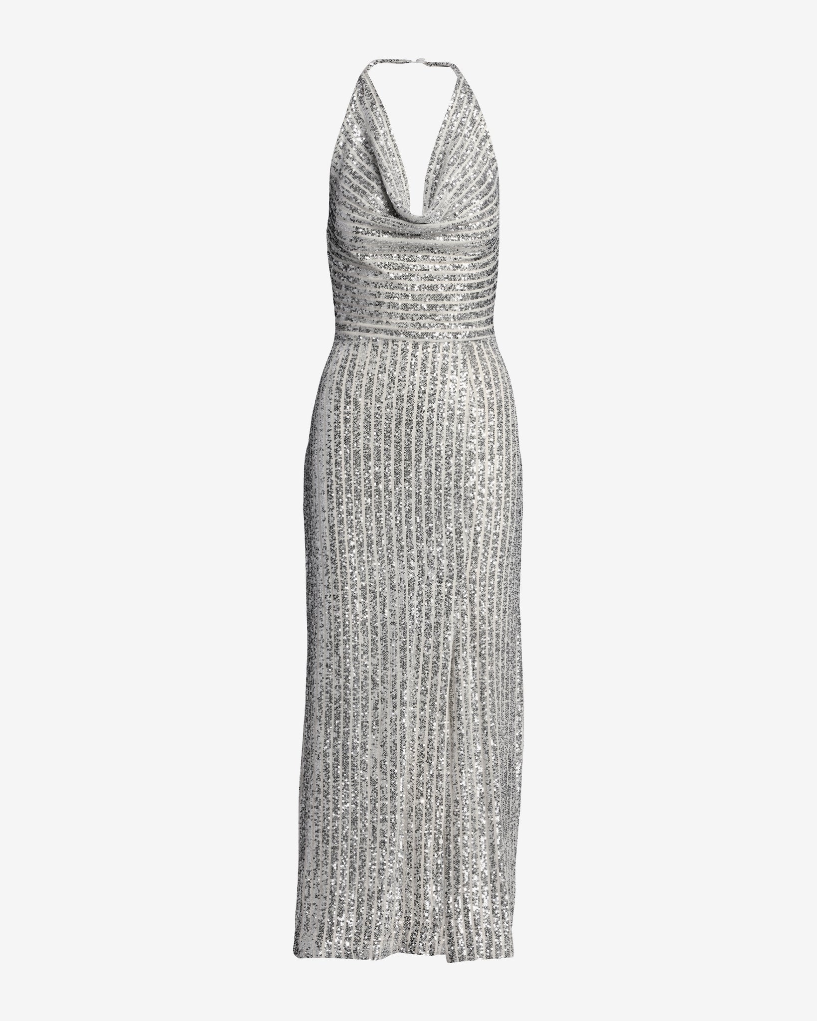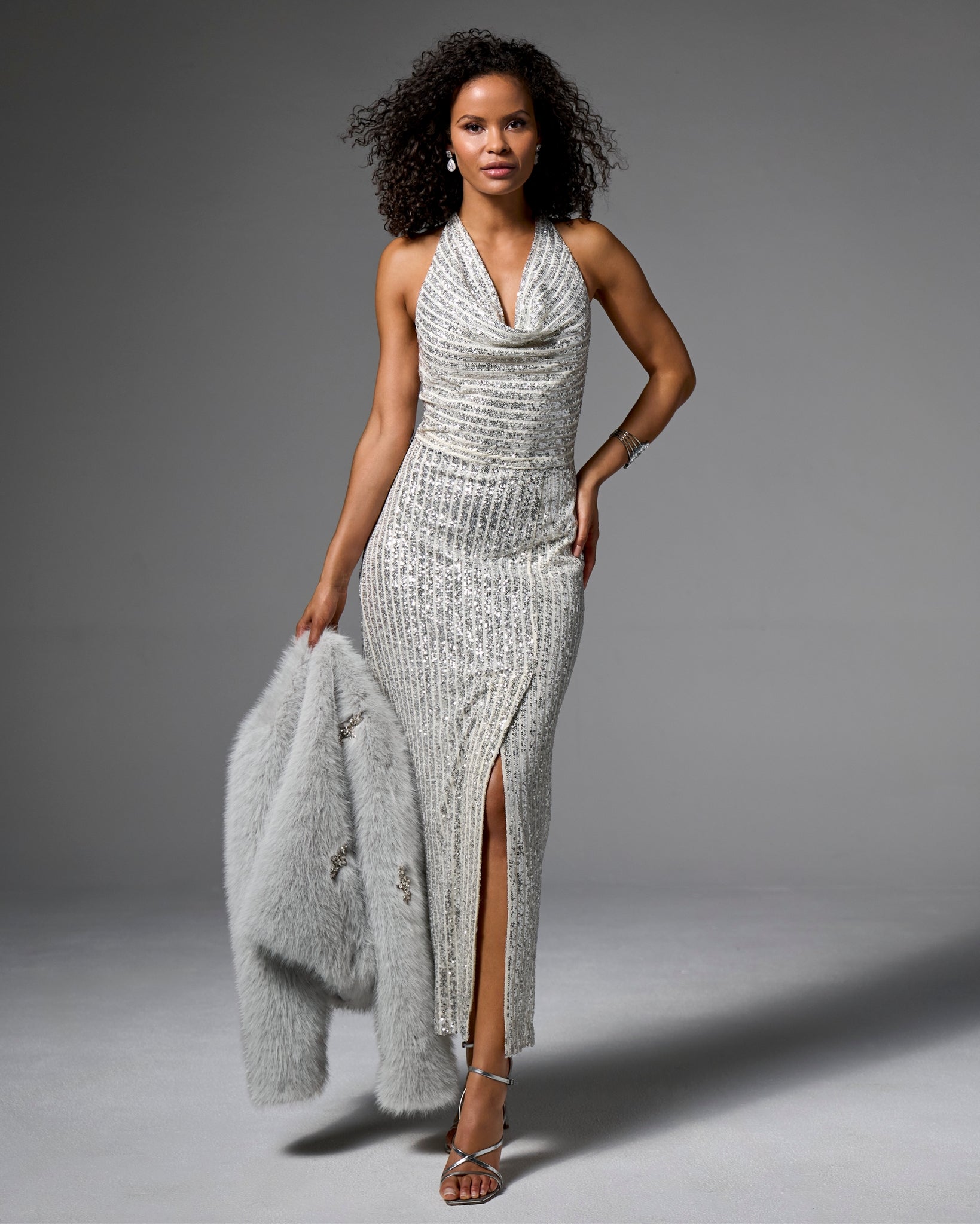 Allover shimmer and a fluid cowl neckline make this gown as easy to wear as it is stunning. The side slit adds movement and the right amount of sexy. Pair with metallic heels for an unforgettable holiday entrance.