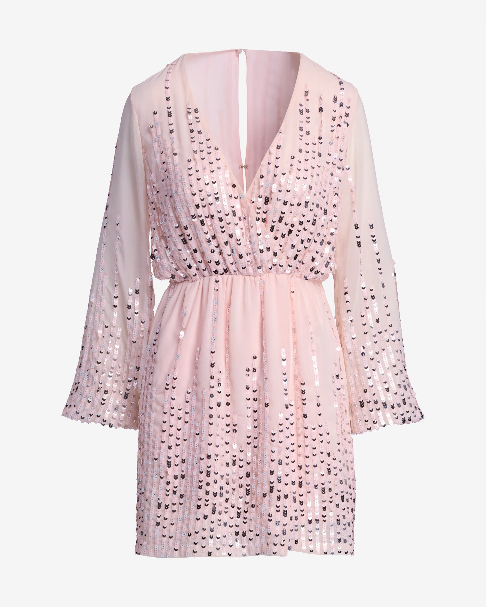 Step into the spotlight in the Shimmer Sequin Surplice Dress. A figure-enhancing surplice cut meets sparkling sequin embellishment for maximum impact. Perfect for winter parties or New Year’s Eve festivities.
